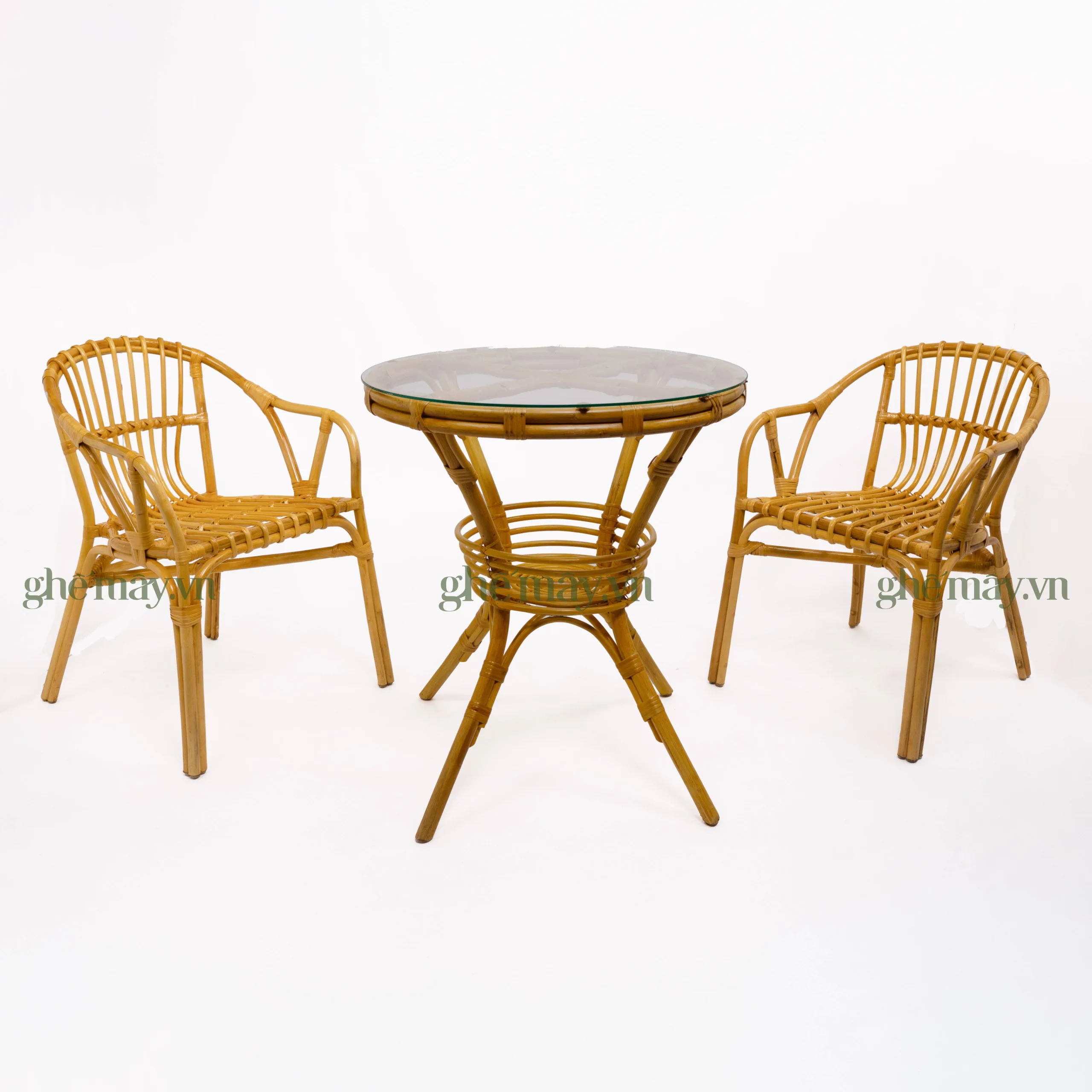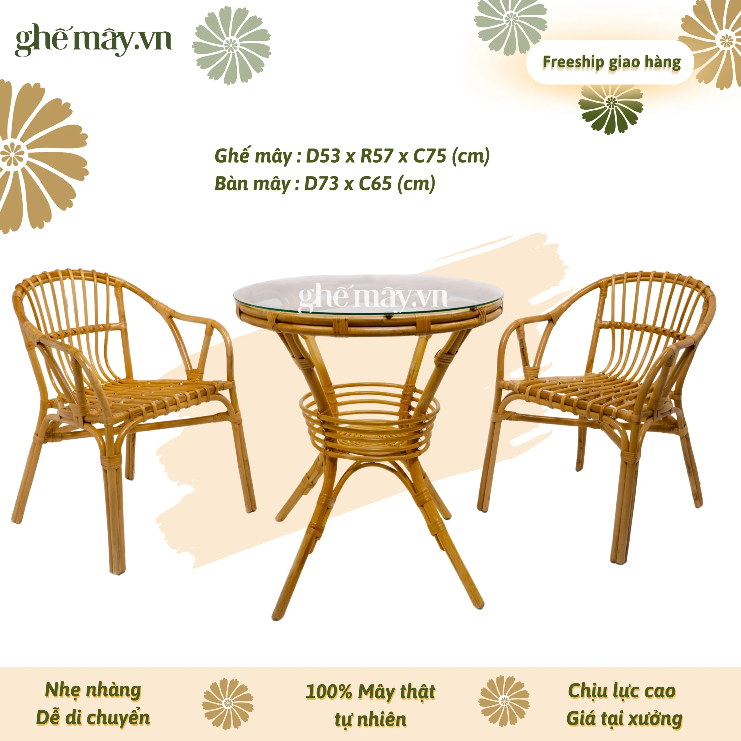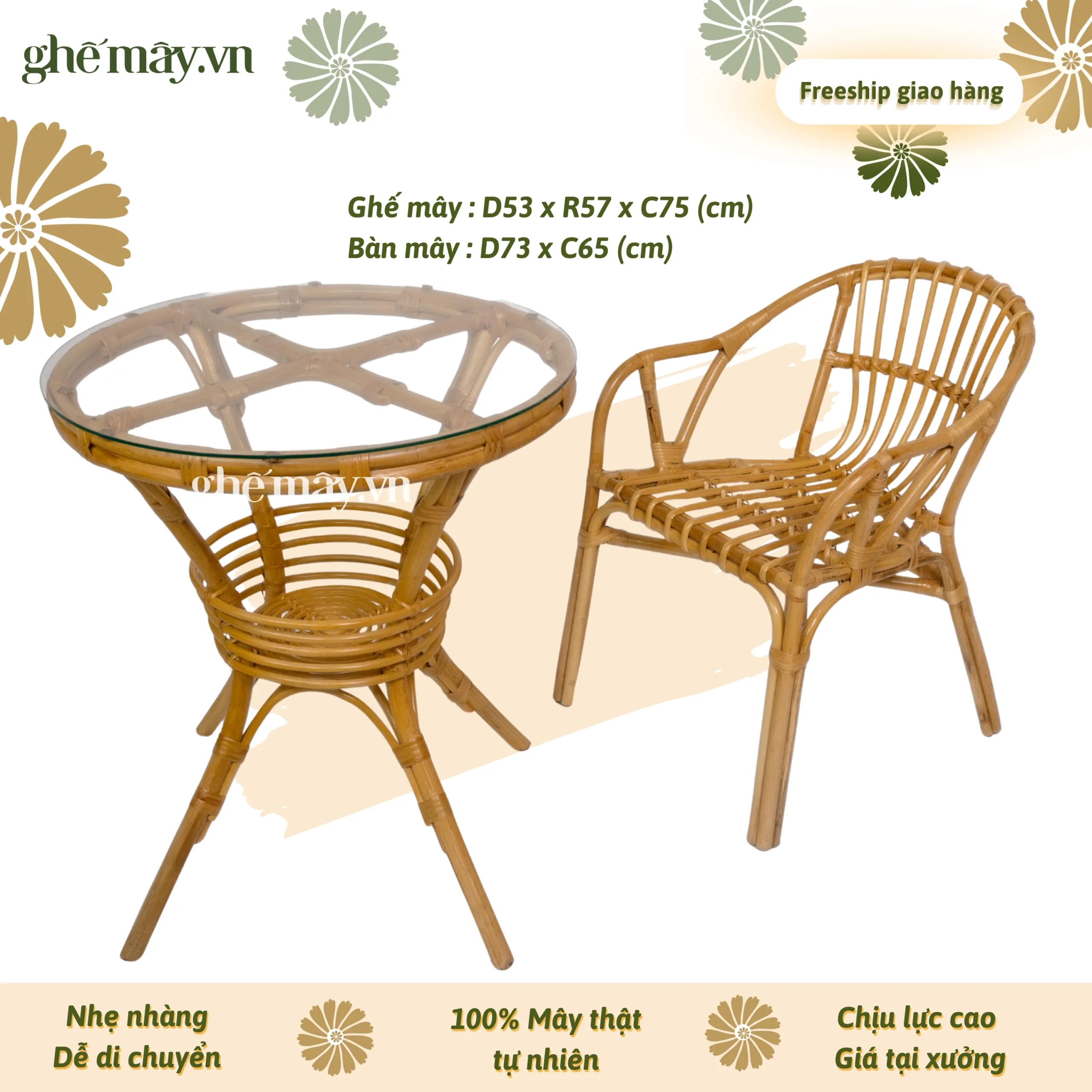 Ghế có thiết kế ôm trọn cơ thể, chiều cao vừa phải và rất chắc chắn. Ghế họa tiết mây uốn lượn đẹp mắt, có thể “cân” được nhiều không gian từ sang trọng đến tối giản. Đi cùng 2 ghế áo khoác là chiếc bàn mặt kính. Bàn mây tương đối rộng rãi, chân bàn được uốn lượn khéo léo, kết hợp cùng tầng dưới là các nhành mây xoay tròn đẹp mắt. Bộ bàn ghế mix vô cùng hợp lý, cân đối sẽ là một sự lựa chọn hợp lý cho những ai yêu thích sự tối giản, tiện lợi.
