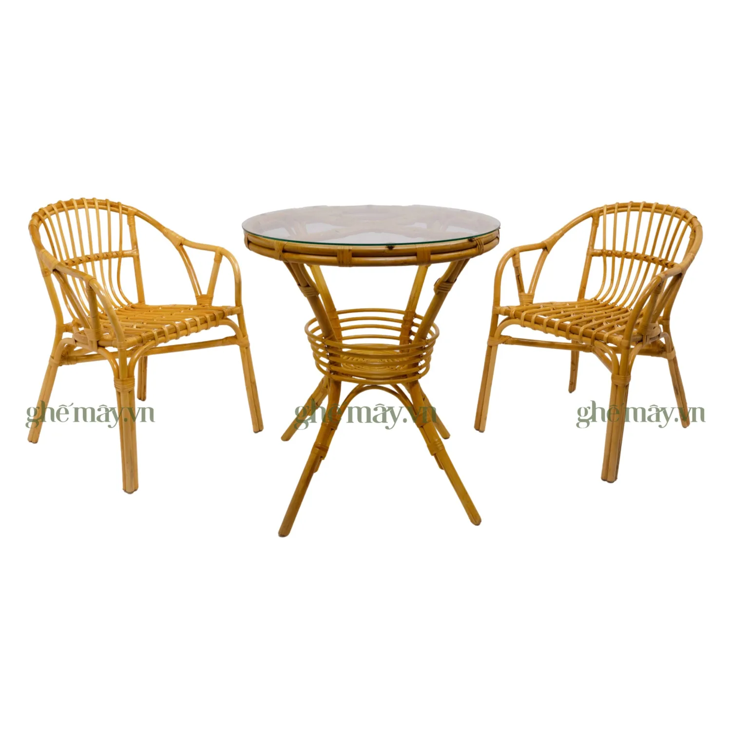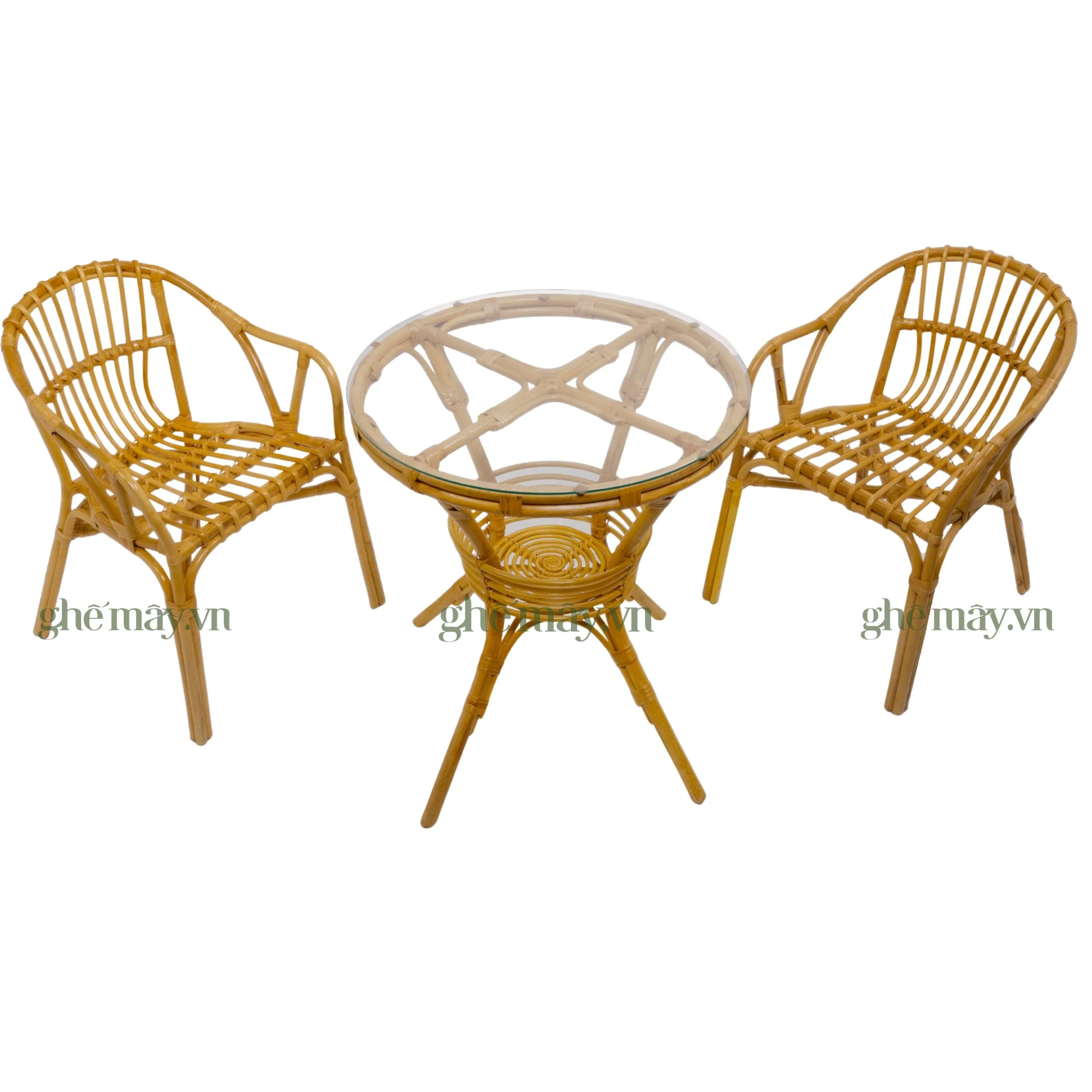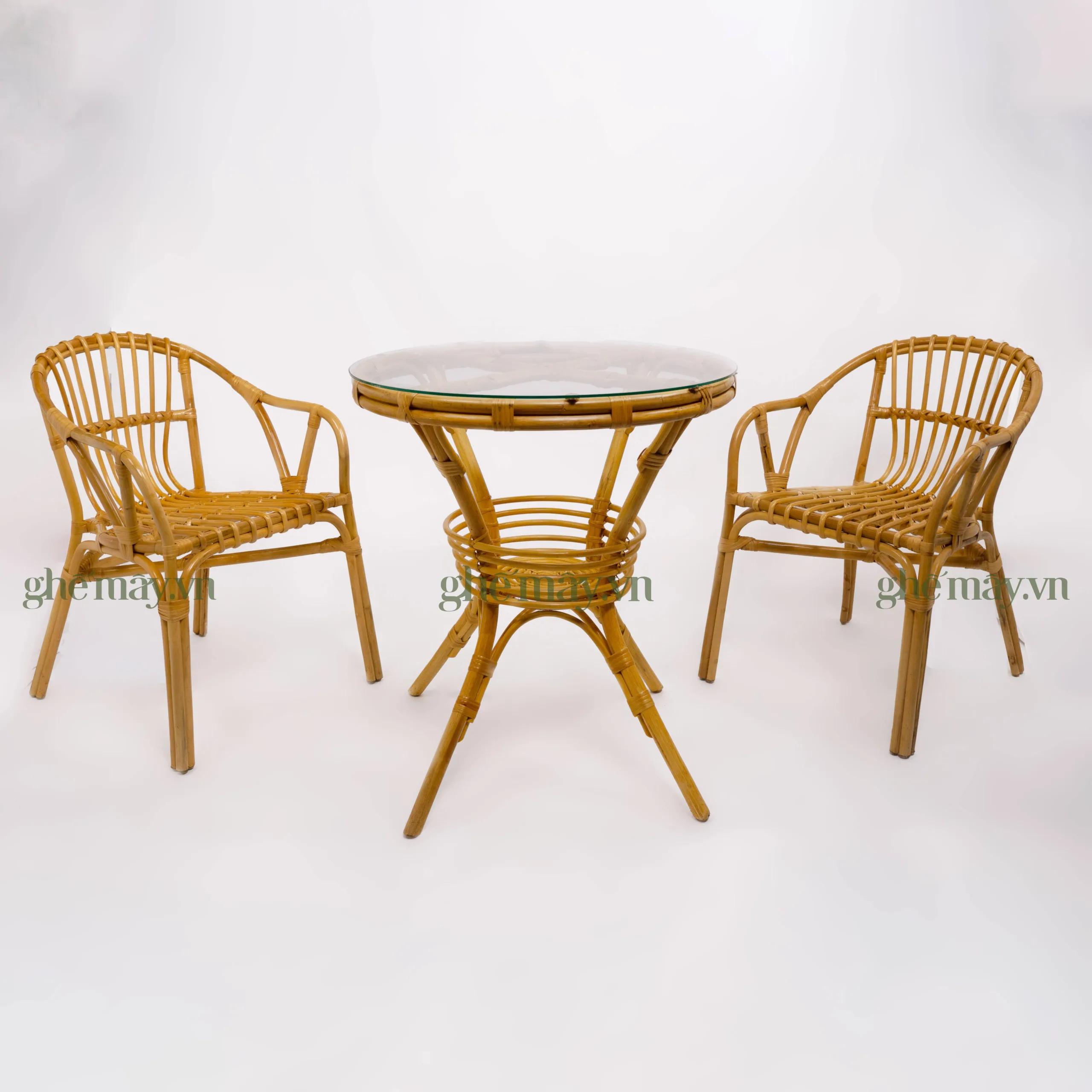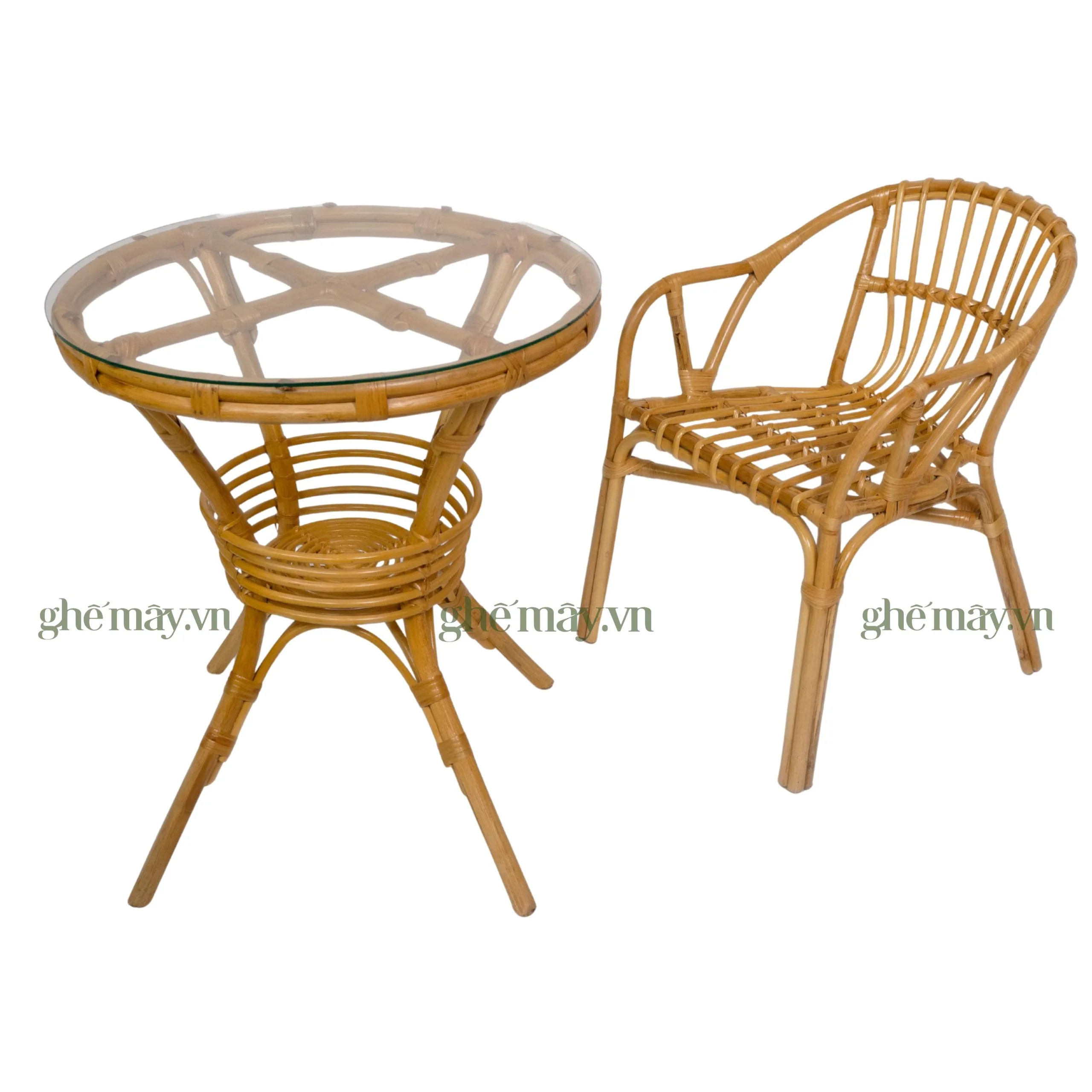 Ghế có thiết kế ôm trọn cơ thể, chiều cao vừa phải và rất chắc chắn. Ghế họa tiết mây uốn lượn đẹp mắt, có thể “cân” được nhiều không gian từ sang trọng đến tối giản. Đi cùng 2 ghế áo khoác là chiếc bàn mặt kính. Bàn mây tương đối rộng rãi, chân bàn được uốn lượn khéo léo, kết hợp cùng tầng dưới là các nhành mây xoay tròn đẹp mắt. Bộ bàn ghế mix vô cùng hợp lý, cân đối sẽ là một sự lựa chọn hợp lý cho những ai yêu thích sự tối giản, tiện lợi.