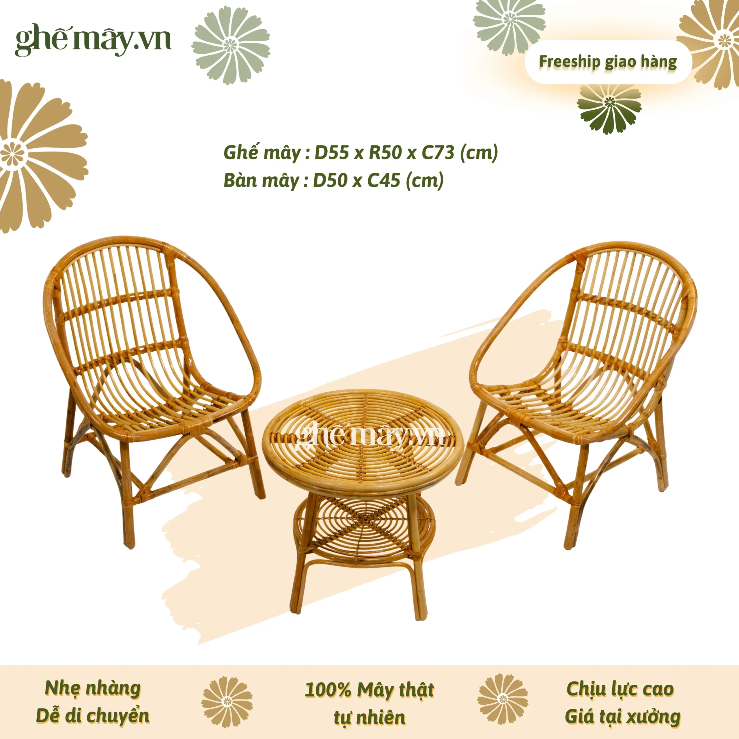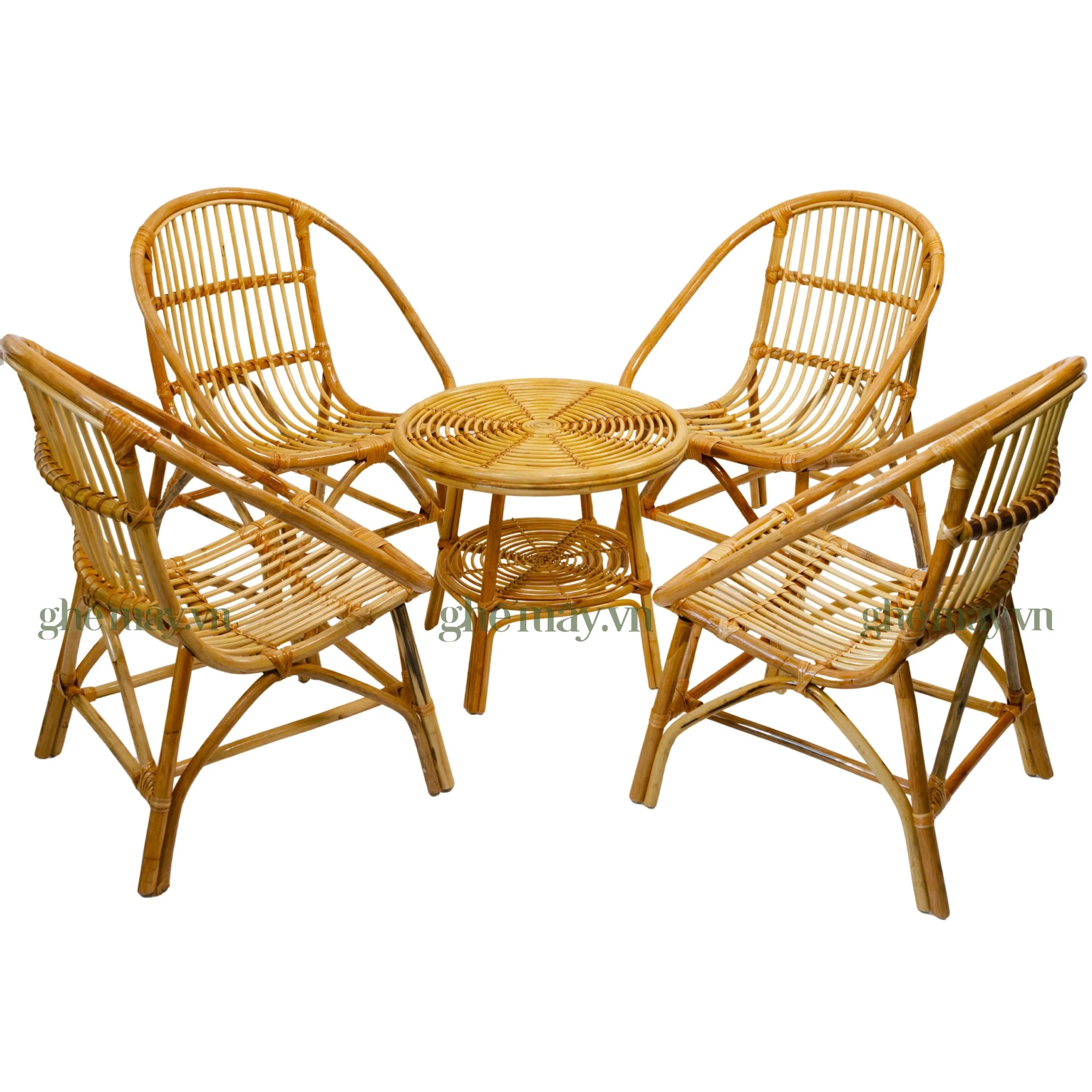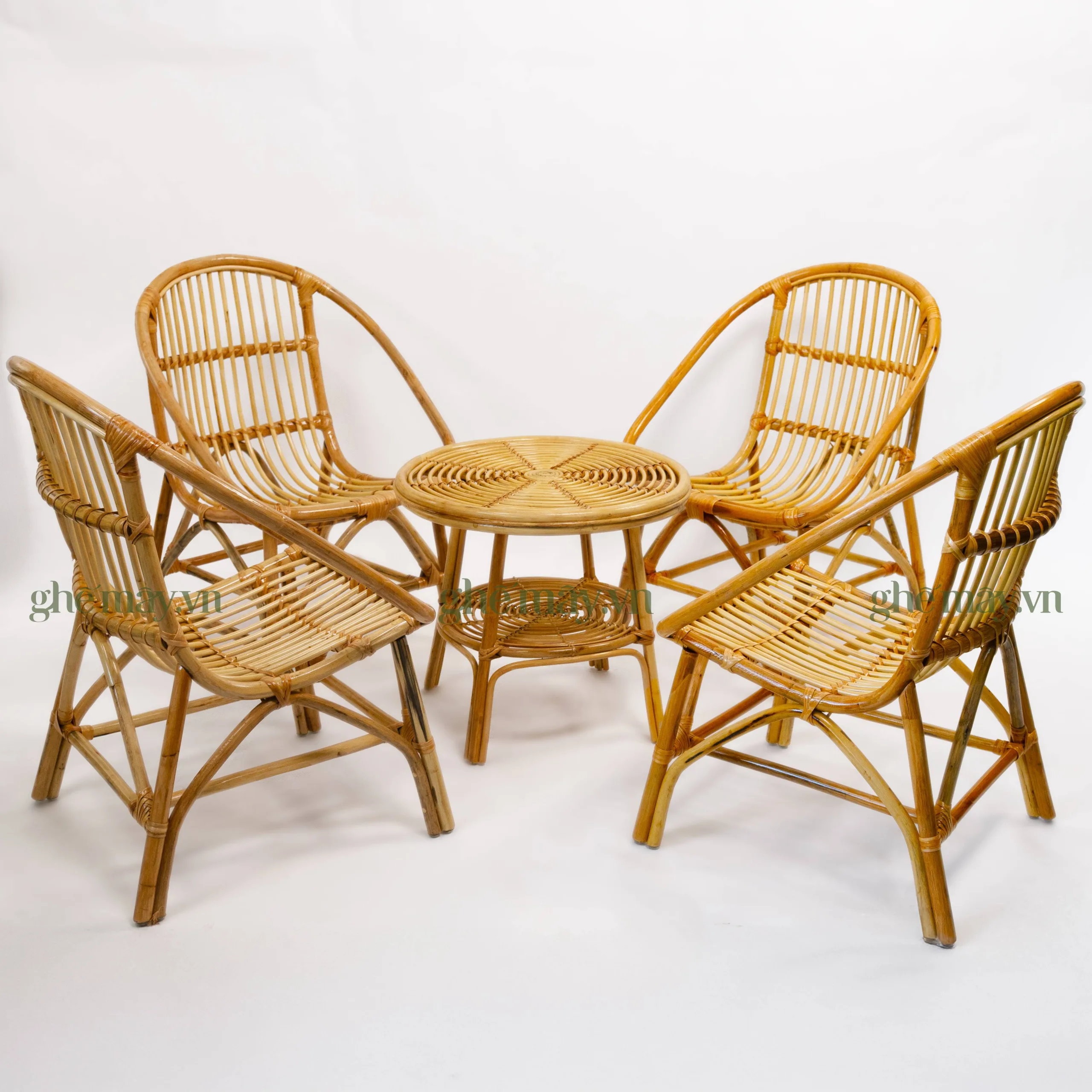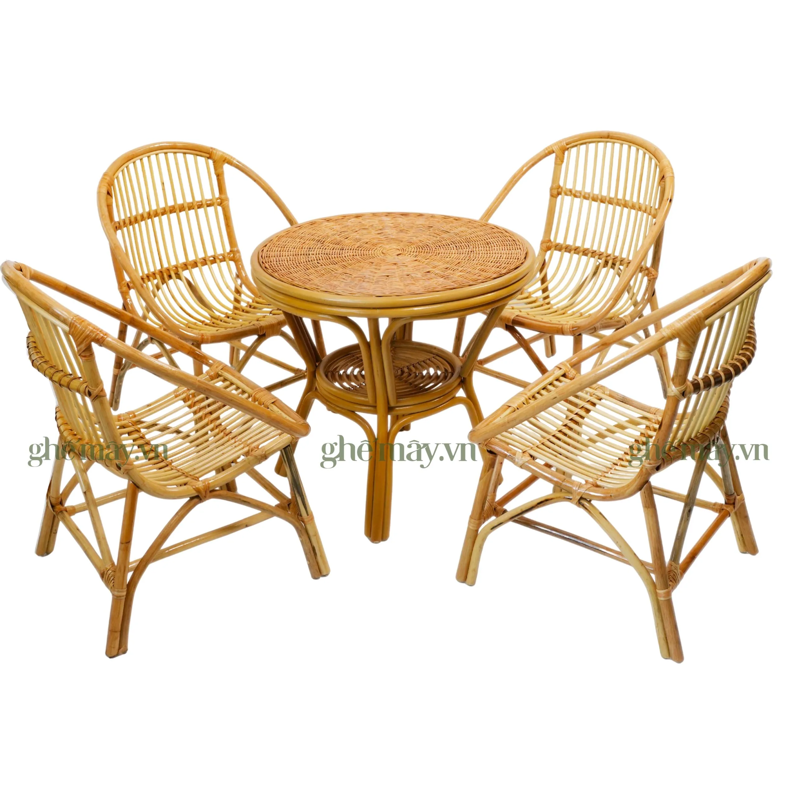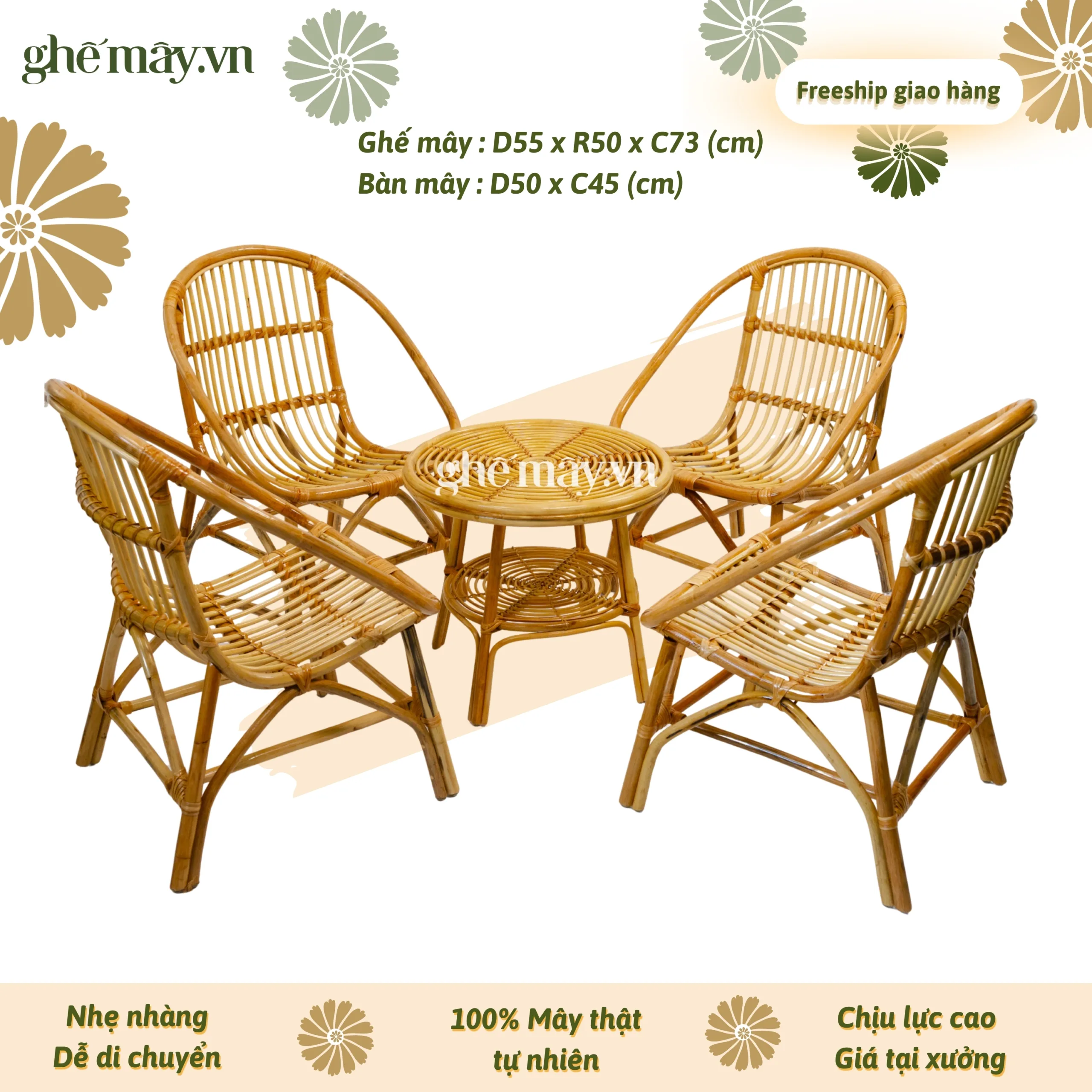 Bộ bàn ghế mây cà phê gồm 4 ghế kèm một bàn vô cùng xinh xắn, thích hợp đặt trong các quán cà phê tối giản, trung tính. Đông thời với kích thước vừa phải, bộ bàn ghế cùng được ứng dụng đặt trên ban công, phòng khách hay phòng riêng vô cùng hợp lý.