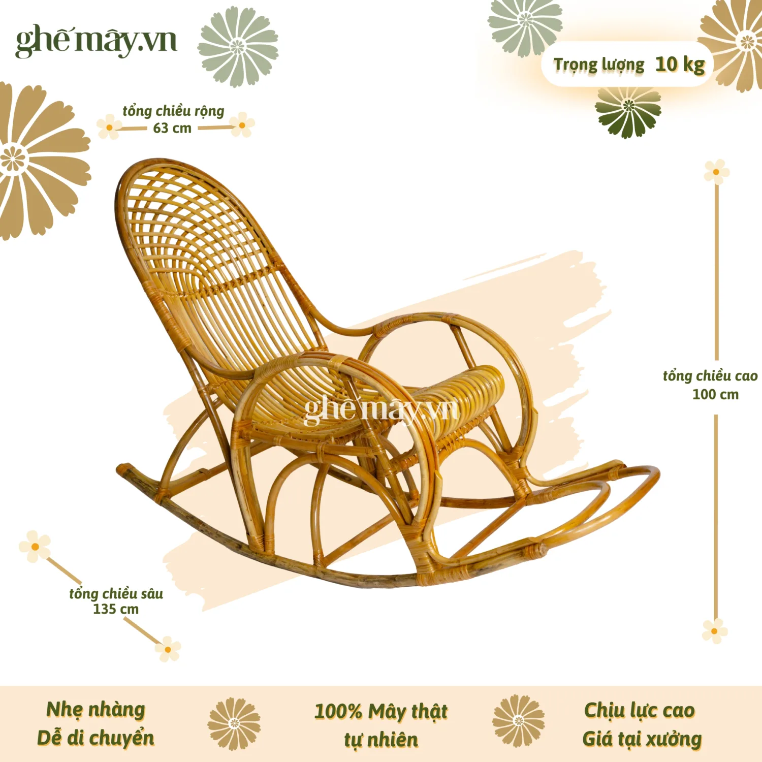 Mỗi chiếc ghế mây bập bênh cầu vồng được thợ lành nghề đan tay tỉ mỉ từ những sợi mây tự nhiên chọn lọc, đảm bảo độ bền vượt trội lên đến 10 năm. Trọng lượng chỉ 10kg, ghế mây này dễ dàng di chuyển mà không cần lắp ráp, sẵn sàng sử dụng ngay khi nhận hàng.