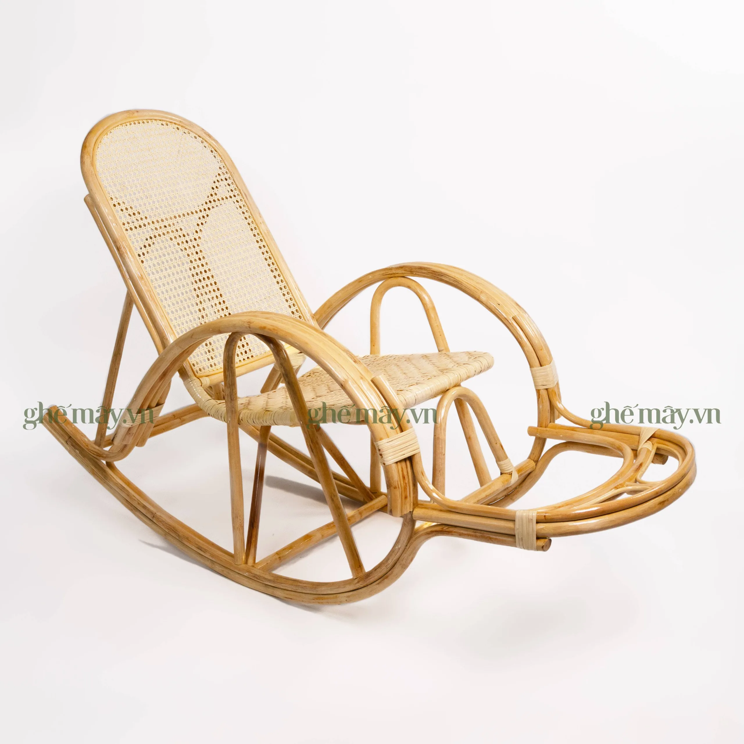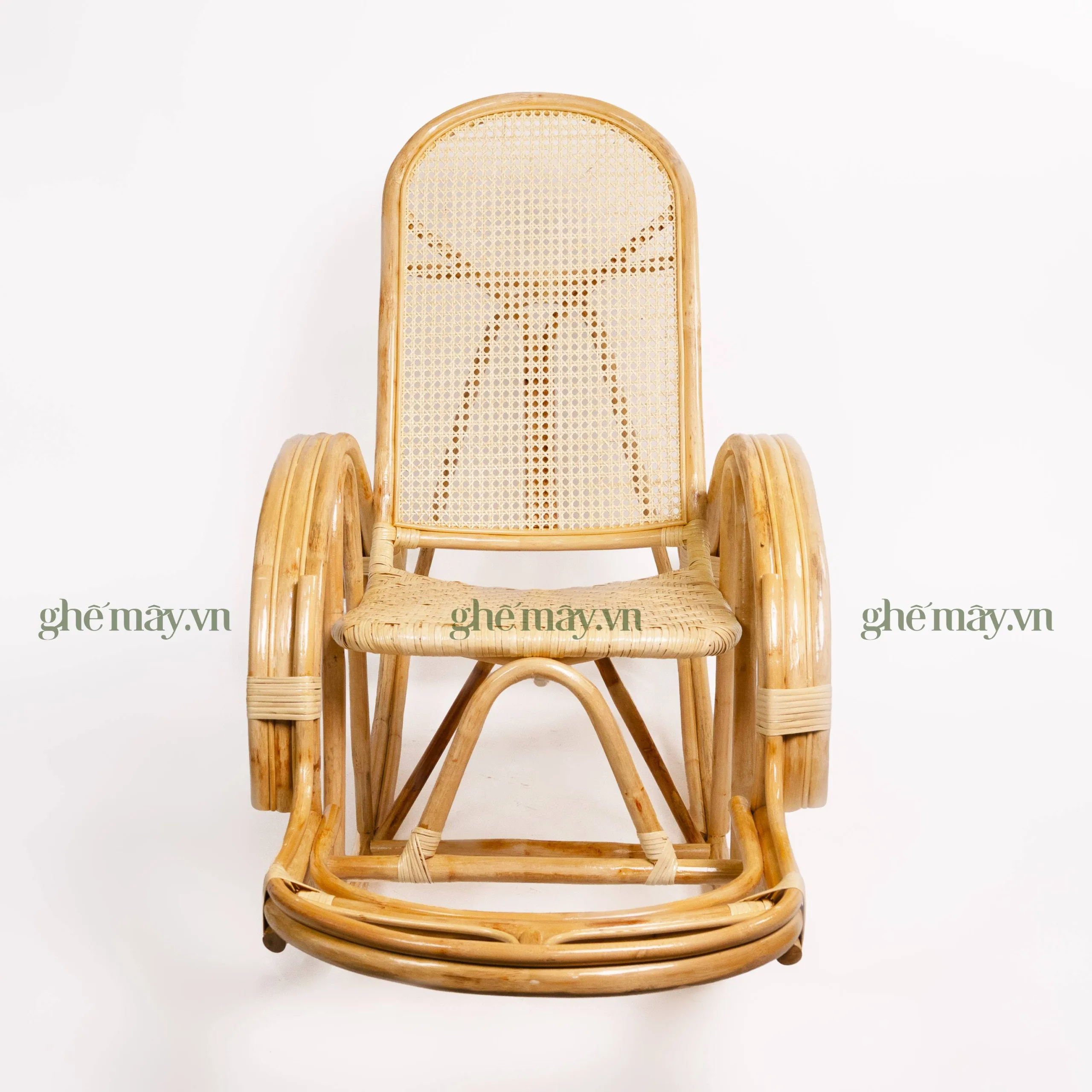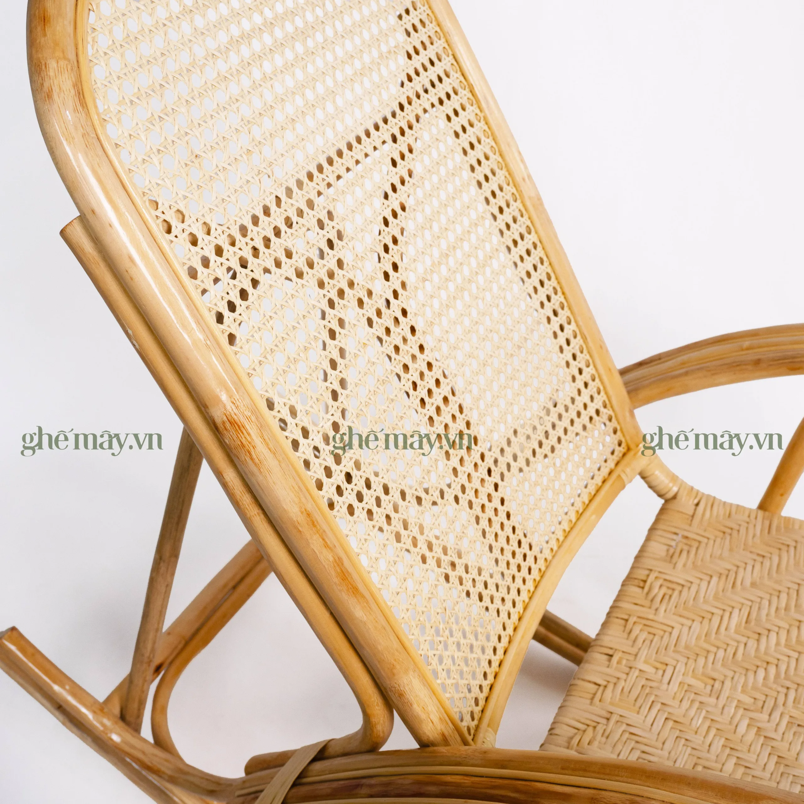 Điểm nhấn nổi bật của ghế bập bênh mây đan lưới nằm ở phần tay vịn được thiết kế mô phỏng như hai bánh xe nhỏ. Thiết kế này không chỉ mang tính thẩm mỹ cao mà còn giúp ghế trở nên thanh thoát, nhẹ nhàng hơn, tạo cảm giác chuyển động êm ái khi bập bênh. Màu sắc của ghế mang tông vàng mây tự nhiên, dễ dàng hài hòa với nhiều phong cách nội thất khác nhau – từ cổ điển, mộc mạc đến hiện đại và tinh giản.