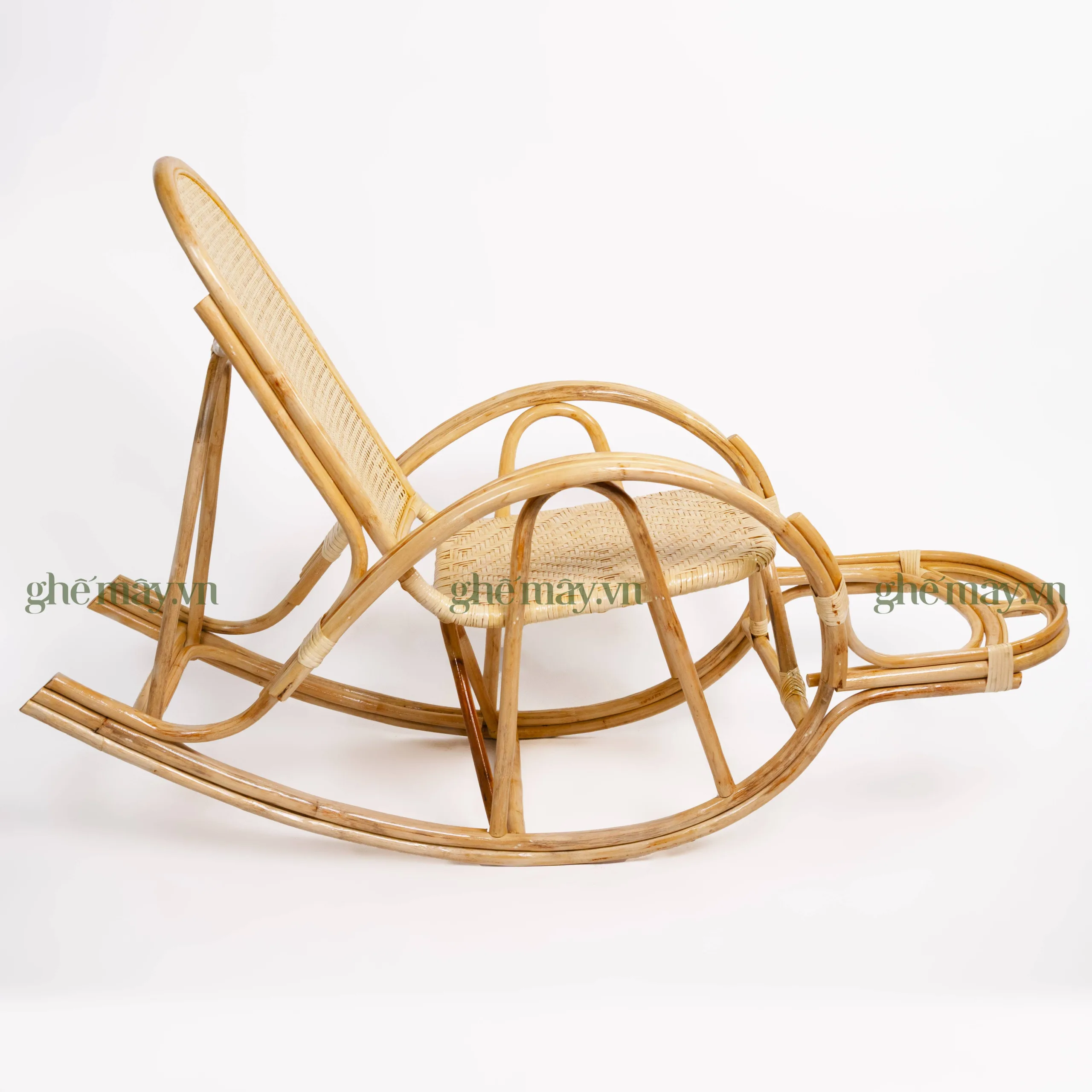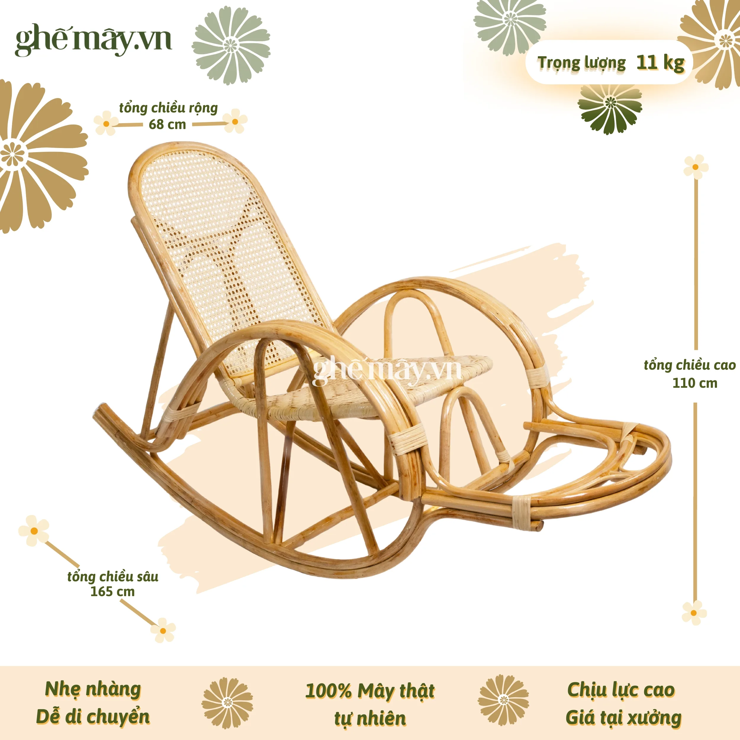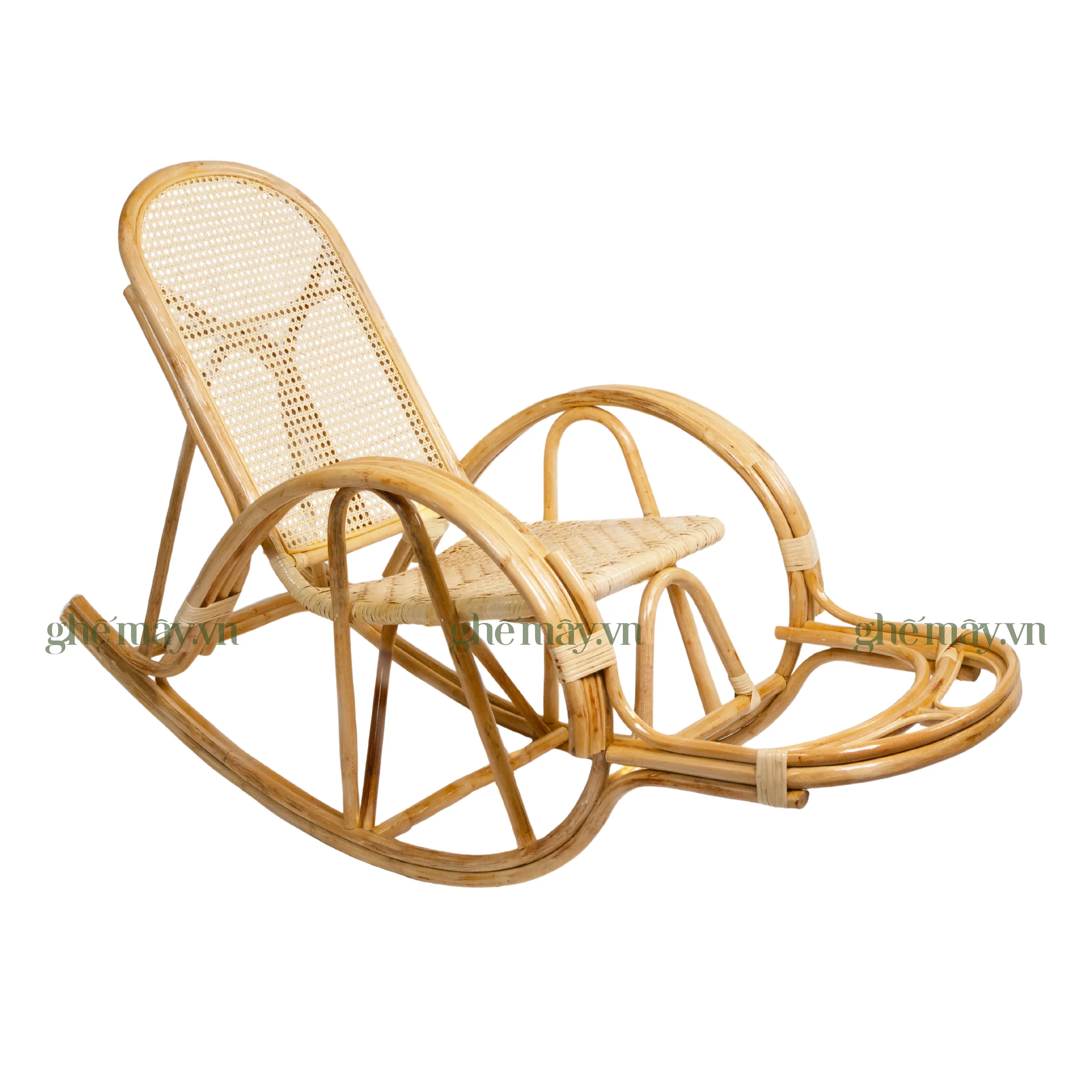 Điểm nhấn nổi bật của ghế bập bênh mây đan lưới nằm ở phần tay vịn được thiết kế mô phỏng như hai bánh xe nhỏ. Thiết kế này không chỉ mang tính thẩm mỹ cao mà còn giúp ghế trở nên thanh thoát, nhẹ nhàng hơn, tạo cảm giác chuyển động êm ái khi bập bênh. Màu sắc của ghế mang tông vàng mây tự nhiên, dễ dàng hài hòa với nhiều phong cách nội thất khác nhau – từ cổ điển, mộc mạc đến hiện đại và tinh giản.