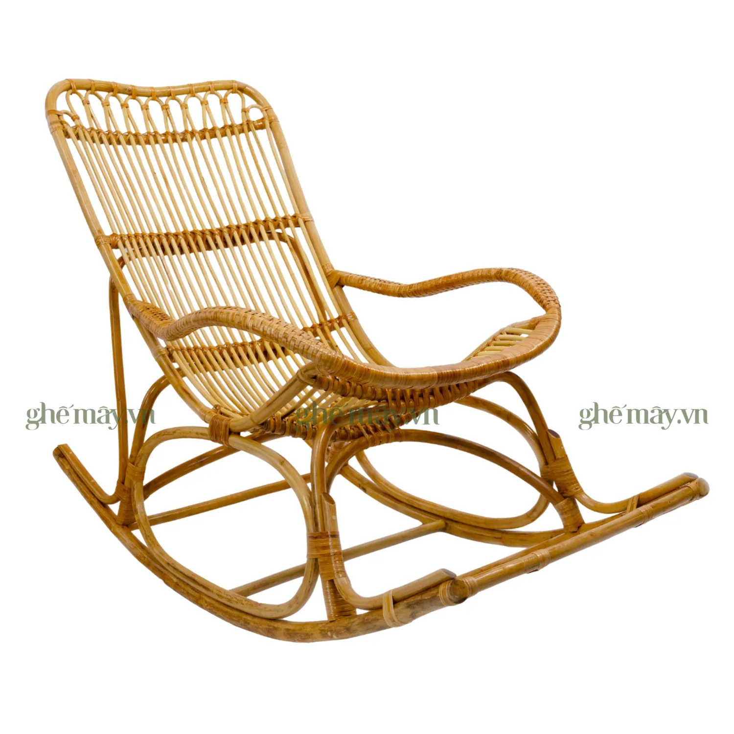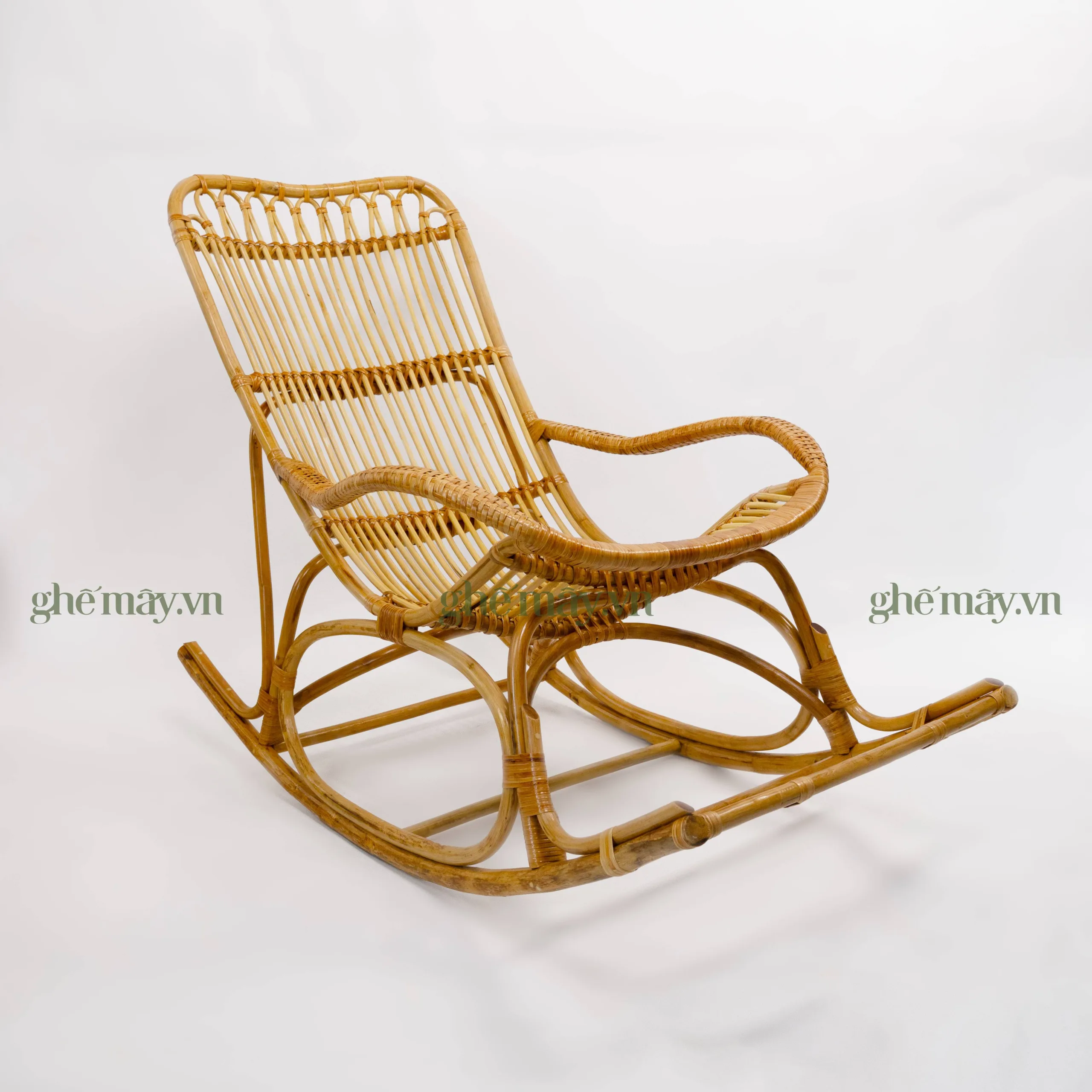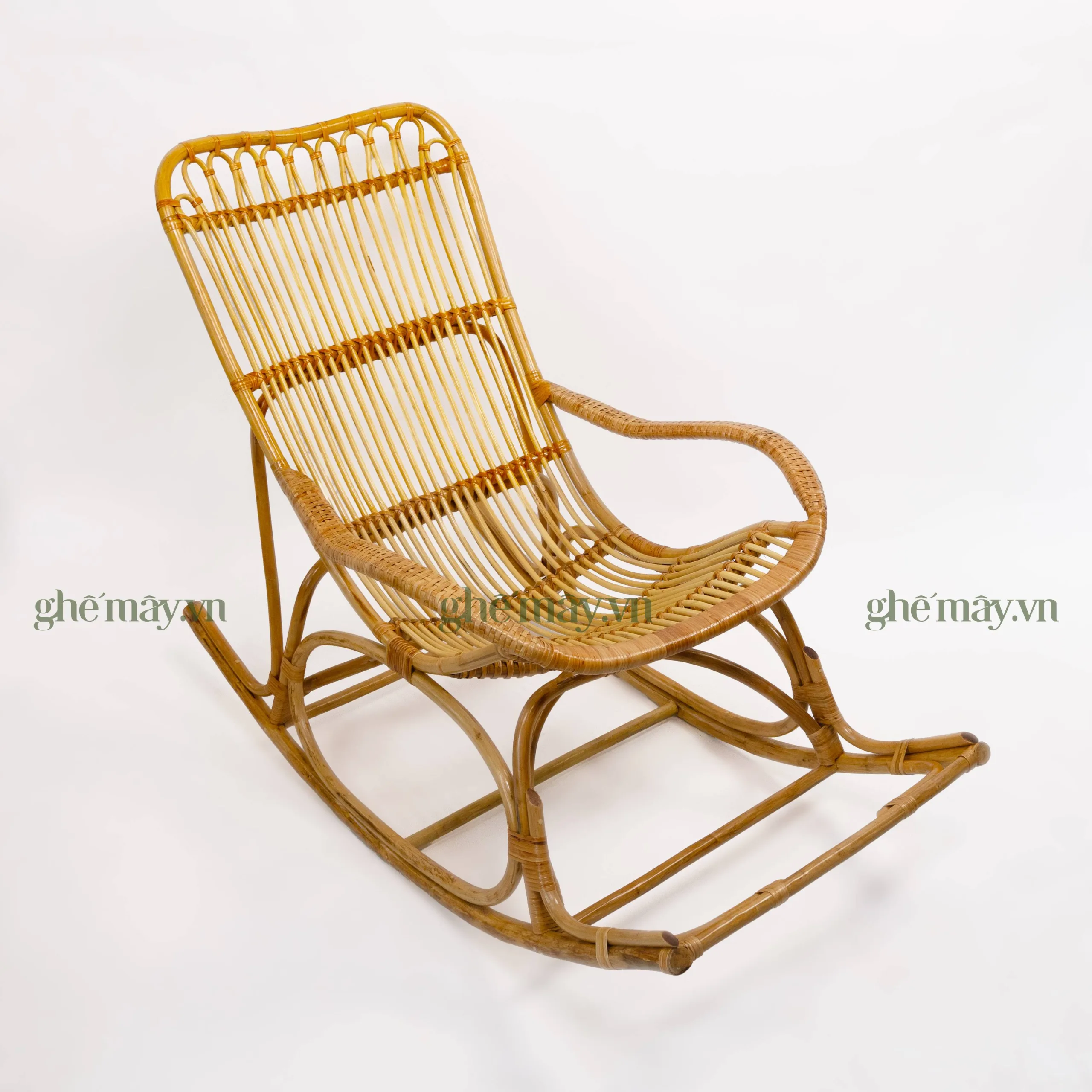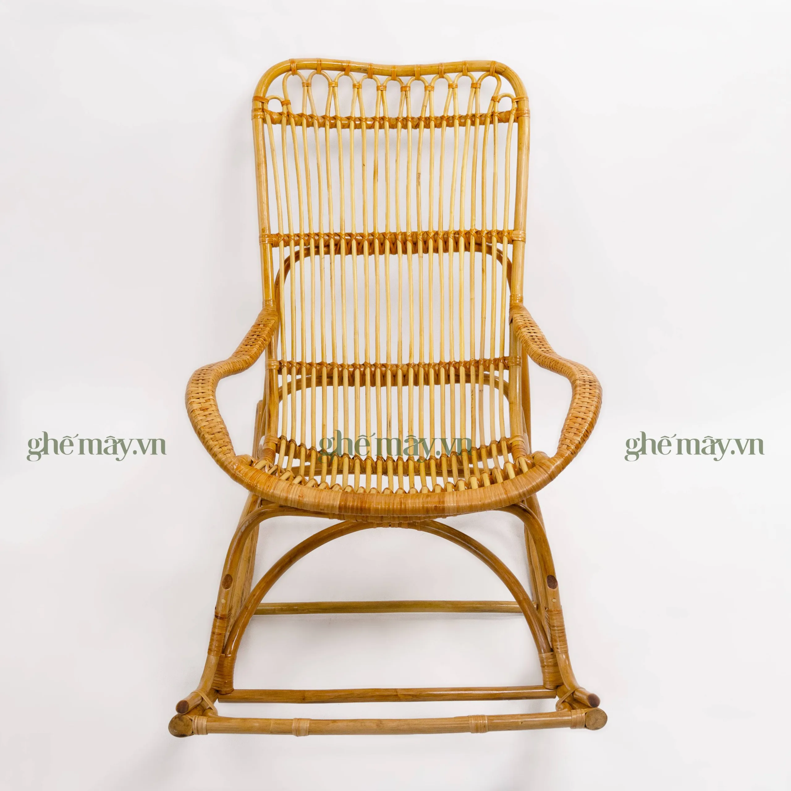 Ghế mây bập bênh tay đan có thiết kế lớn, chịu tải tốt đồng thời phần lưng ghế cũng được làm trũng xuống vừa phải, tạo sự êm ái cho người ngồi ghế. Phần tựa tay của ghế được nghệ nhân đan mây thủ công vô cùng đẹp mắt, đường mây khít với họa tiết đan xen tạo sự cao cấp, mĩ nghệ. Lưng ghế cũng được tạo chi tiết mây uốn cong nhẹ nhàng, lượn lên đỉnh ghế rồi chạy dọc xuống điểm cuối của ghế, làm cho tổng thể ghế trở nên hài hòa và sinh động hơn.