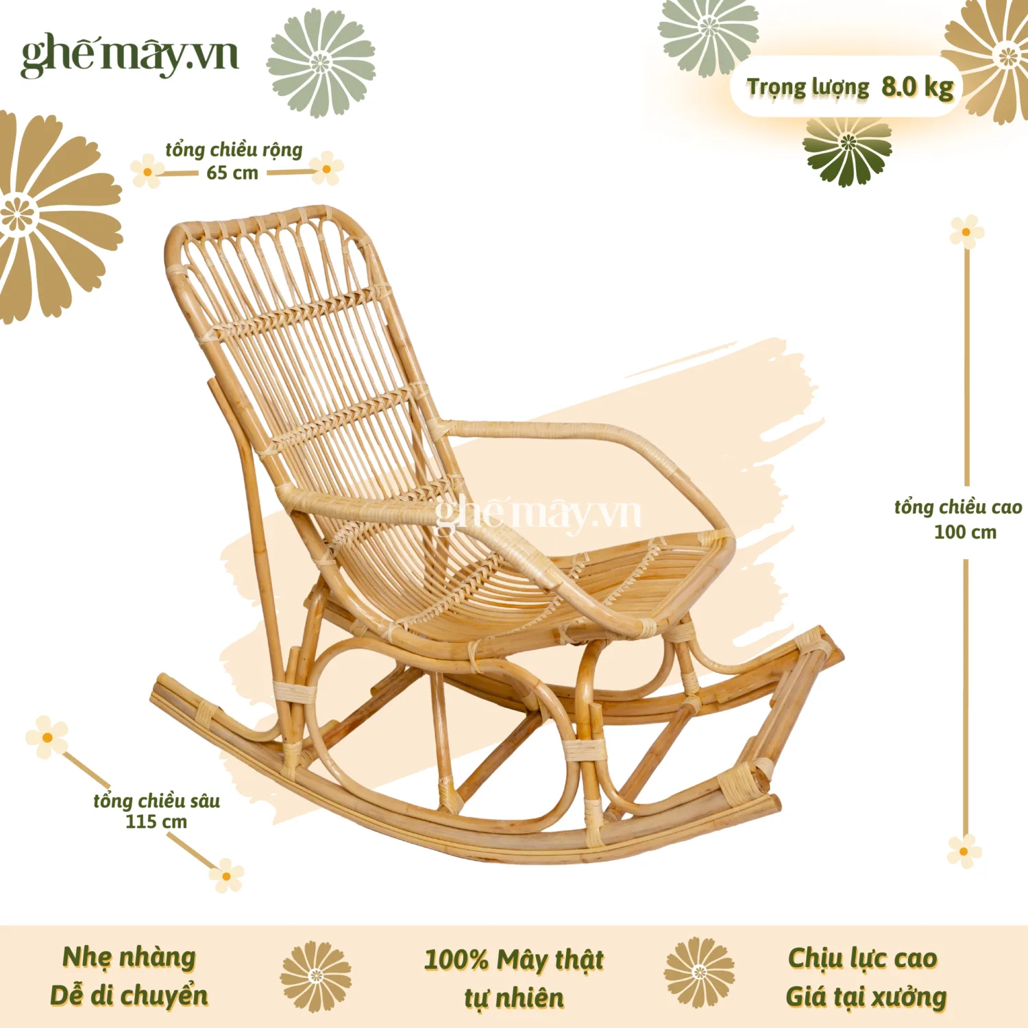 Ghế được làm từ mây tre tự nhiên với màu sắc trung tính, nhẹ nhàng cùng hoa văn mây uốn lượn cùng màu sẽ là một điểm cộng cho những ai yêu thích sự hài hòa. Ghế thiết kế có tay đan là điểm nhấn độc đáo, làm cho ghế không bị nhàm chán, tăng tính sáng tạo cho sản phẩm.