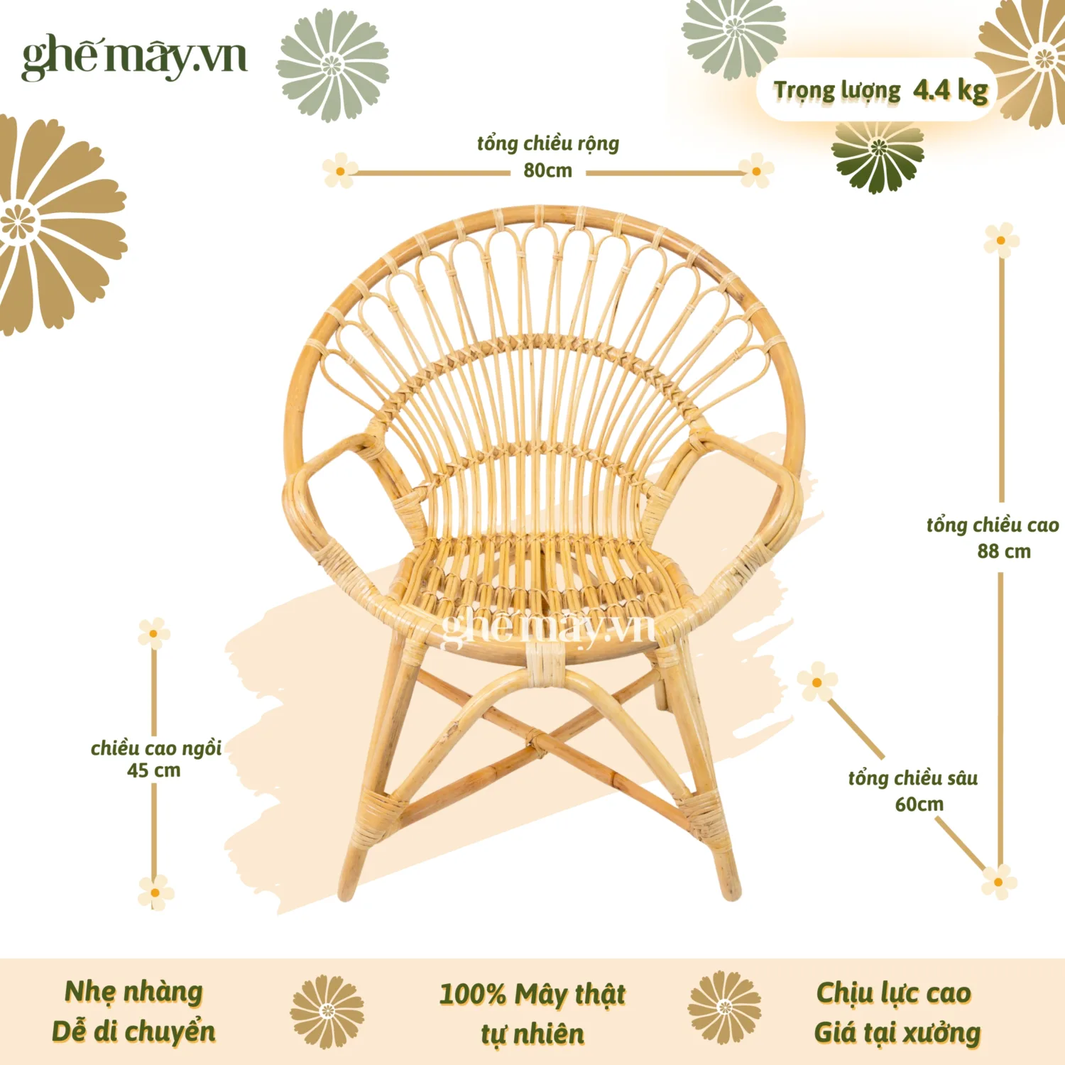 Chiếc ghế được thiết kế với bốn chân trụ vững chắc, khung tròn làm từ những nhành mây to khỏe, được chọn lọc kỹ càng và xử lý cẩn thận để đảm bảo độ bền cao. Cấu trúc chắc chắn giúp ghế chịu được lực tốt, mang lại sự an tâm cho người sử dụng trong quá trình sinh hoạt hằng ngày. Với sự chăm chút tỉ mỉ trong từng chi tiết, ghế mây đuôi công không chỉ là vật dụng nội thất mà còn là sản phẩm thể hiện gu thẩm mỹ và phong cách sống của chủ nhân ngôi nhà.