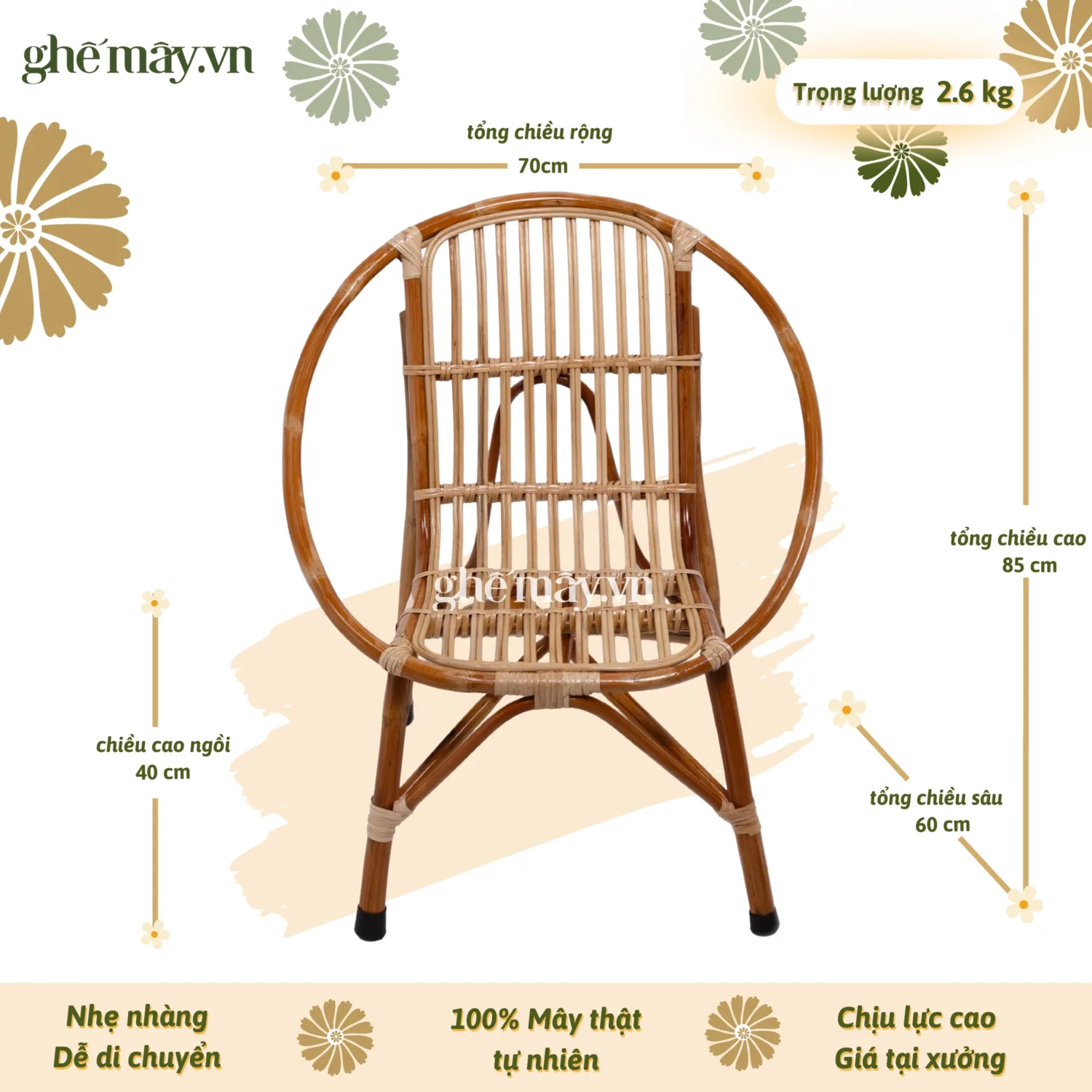 Ghế mây sò bầu (nhỏ) vô cùng nổi bật có thể trở thành một điểm nhấn trong không gian của bạn. Với màu sắc đâm hơn, chi tiết mây cùng những nốt thắt mây nổi bật hơn, ghế mây sò bầu là một chiếc ghế được ưa dùng trong không gian nhà cửa, homestay cũng như các quán cafe, quán ăn phong cách tối giản, truyền thống.